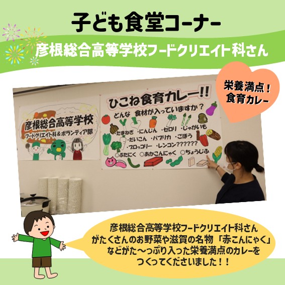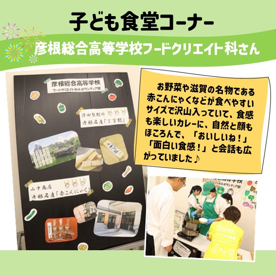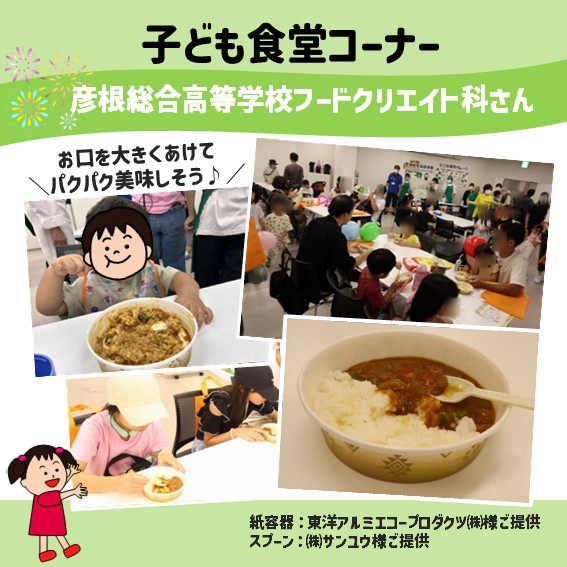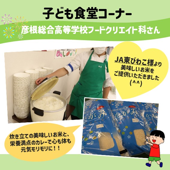 <子ども食堂コーナーにご協力いただいた皆さま> ・彦根総合高等学校フードクリエイト科 様<食材等のご提供にご協力いただいた企業さま> ・精米(JA東びわこ 様) ・紙容器(東洋アルミエコープロダクツ㈱ 様) ・スプーン(㈱サンユウ 様)————————————-