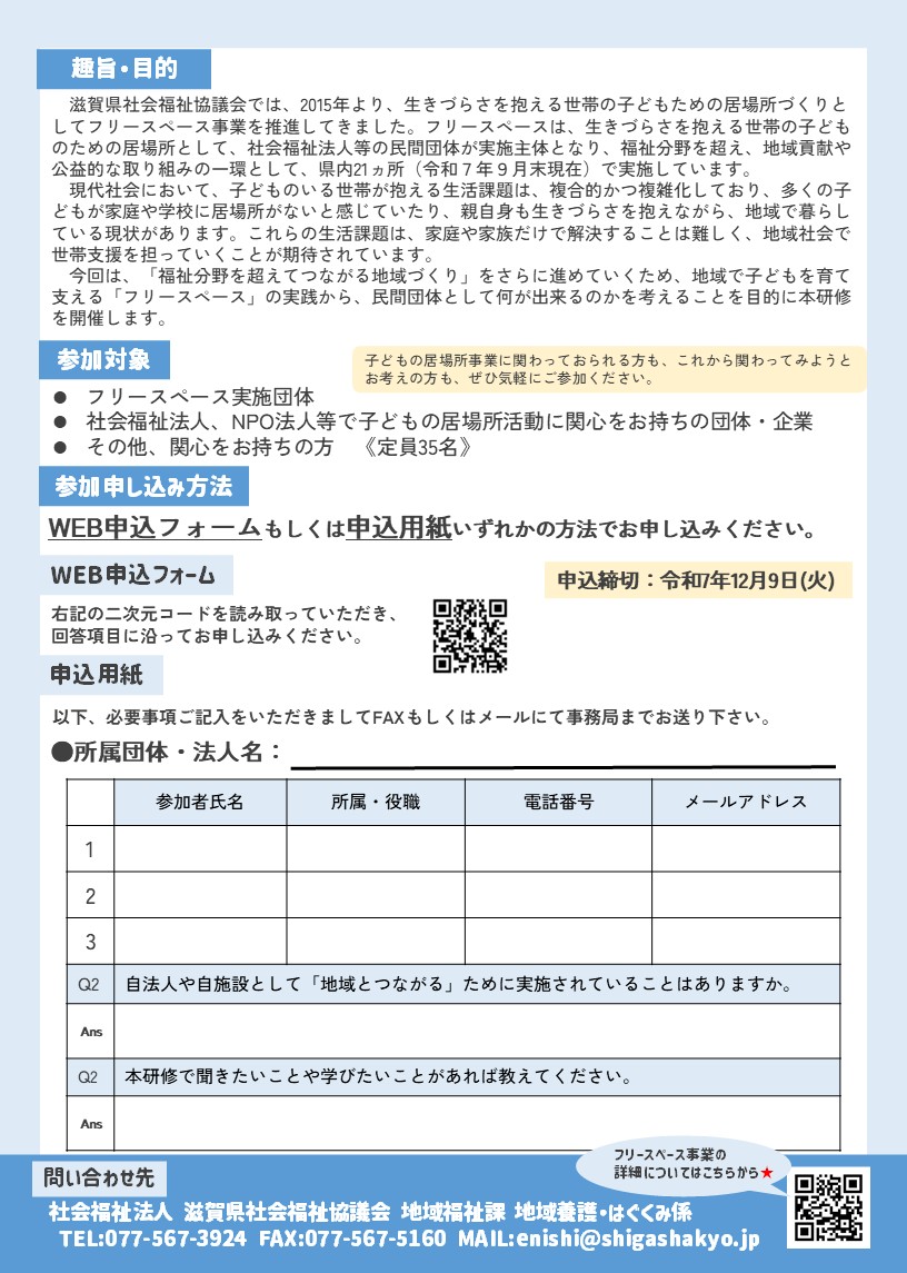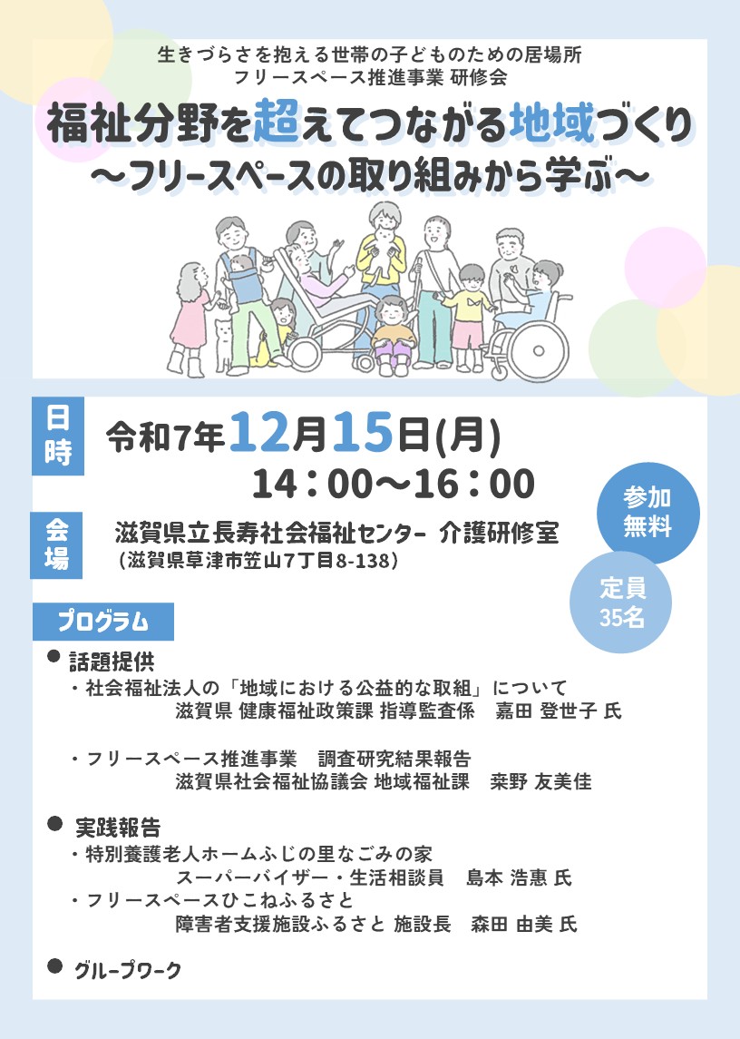 今回は、福祉分野を超えてつながる地域づくりをさらに進めていくため、地域で子どもを育て支える「フリースペース」の実践から民間団体として何が出来るのかを考えることを目的に、別添要項およびチラシの通り研修を開催します。