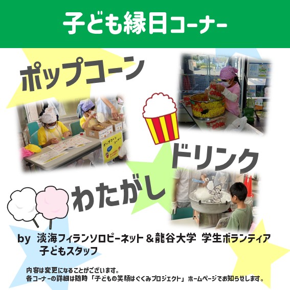 淡海フィランソロピーネット・龍谷大学 学生ボランティア・子どもスタッフによる縁日コーナーには、「ポップコーン」「わたがし」「ドリンク」のコーナーがあります♪