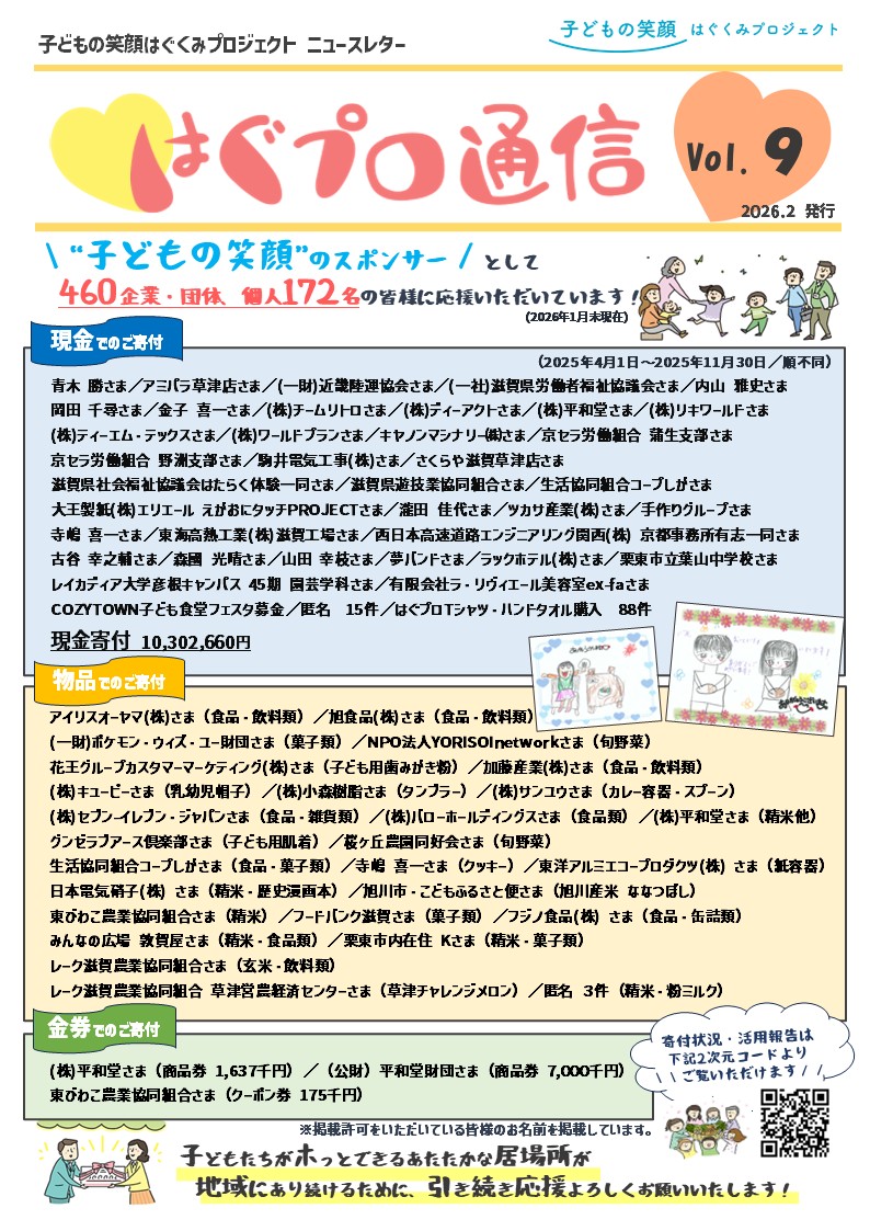 この通称『はぐプロ』に賛同いただいた皆さまについて、“子どもの笑顔”のスポンサーとしてスポンサー登録いただいており、2026年1月末現在で、460企業・団体、個人172名の皆さまに応援いただいています。